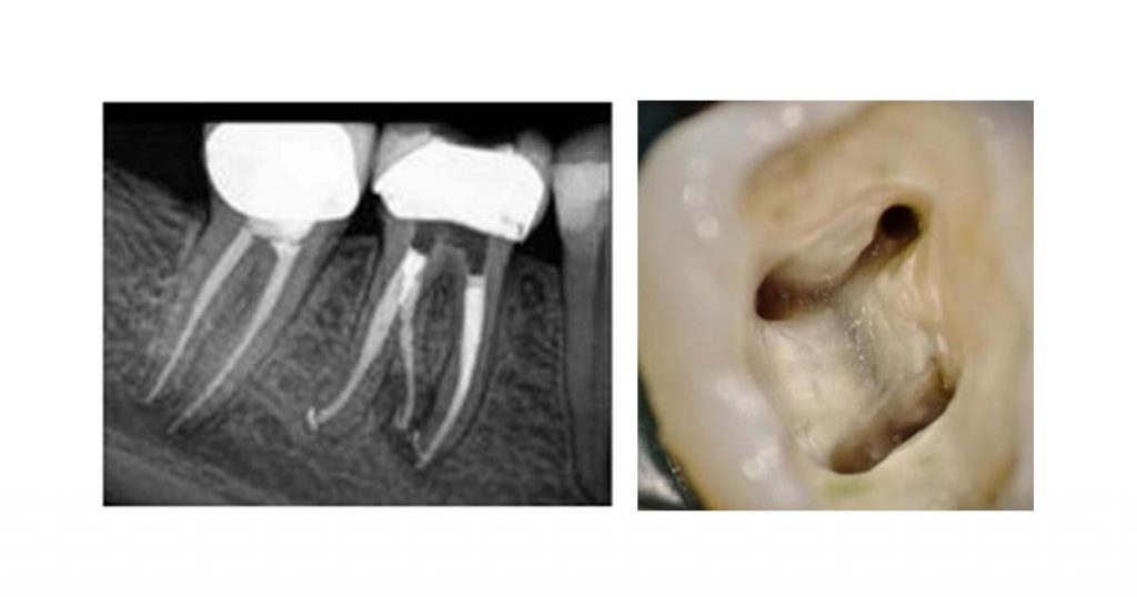 When a tooth requiring endodontic treatment already has an existing crown with a good marginal seal, crown removal may not be necessary. However, maintaining proper bur orientation and parallelism with the tooth's long axis during access opening can be challenging. Failure to do so may lead to incomplete caries removal, perforations, or inadequate cleaning and shaping, ultimately causing endodontic failures.