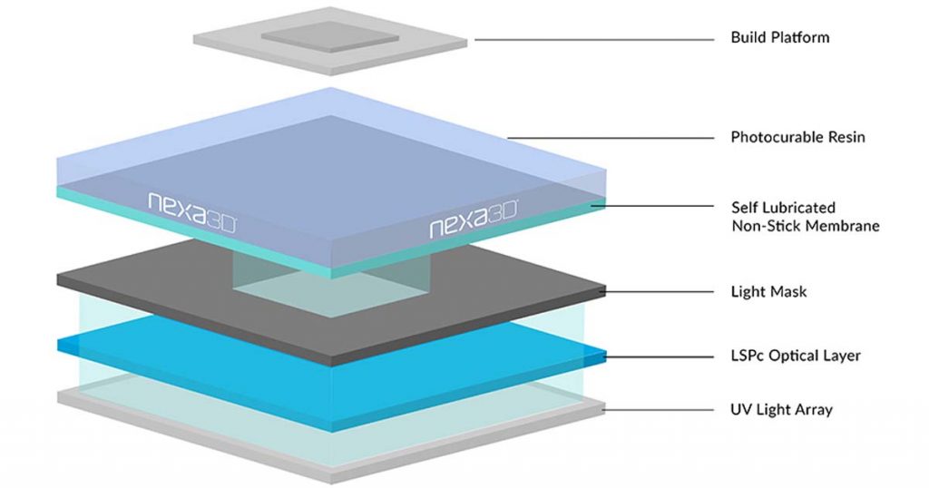 This technology combines a UV light array with an LSPc Optical Lens layer for uniformity, which helps optimize the use of an LSPc High Contrast Mask. This mask is responsible for projecting 3D image slices into the vat for layer-by-layer photopolymerization. These printers are capable of the fastest large-volume, high-resolution 3D printing.