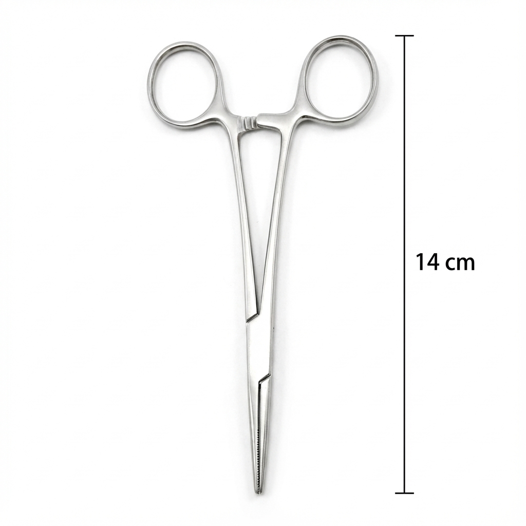 Straight artery forceps with serrated blades and locking ratchet to clamp bleeding vessels or to grasp delicate tissues