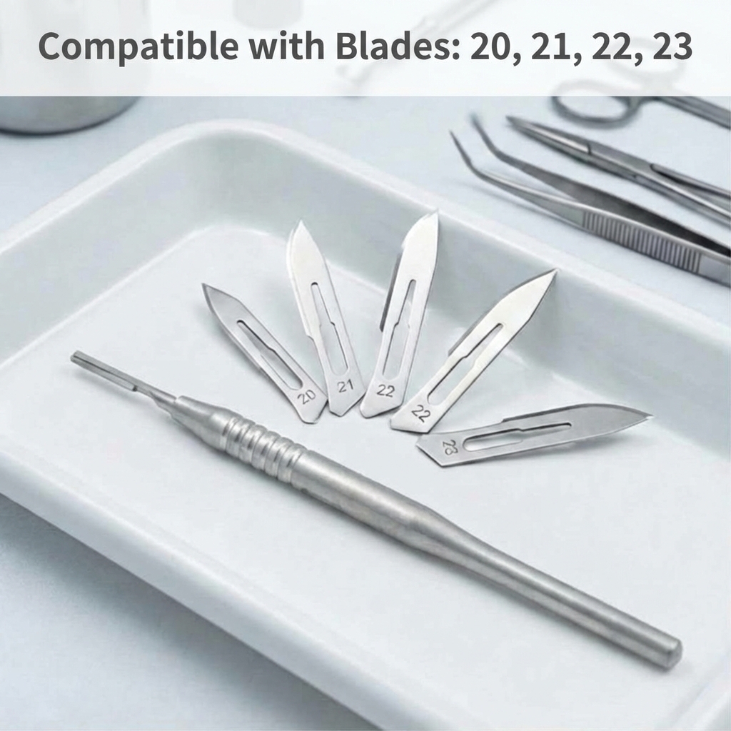 The scalpel handle is made of high-quality stainless steel, ensuring durability and resistance to corrosion.