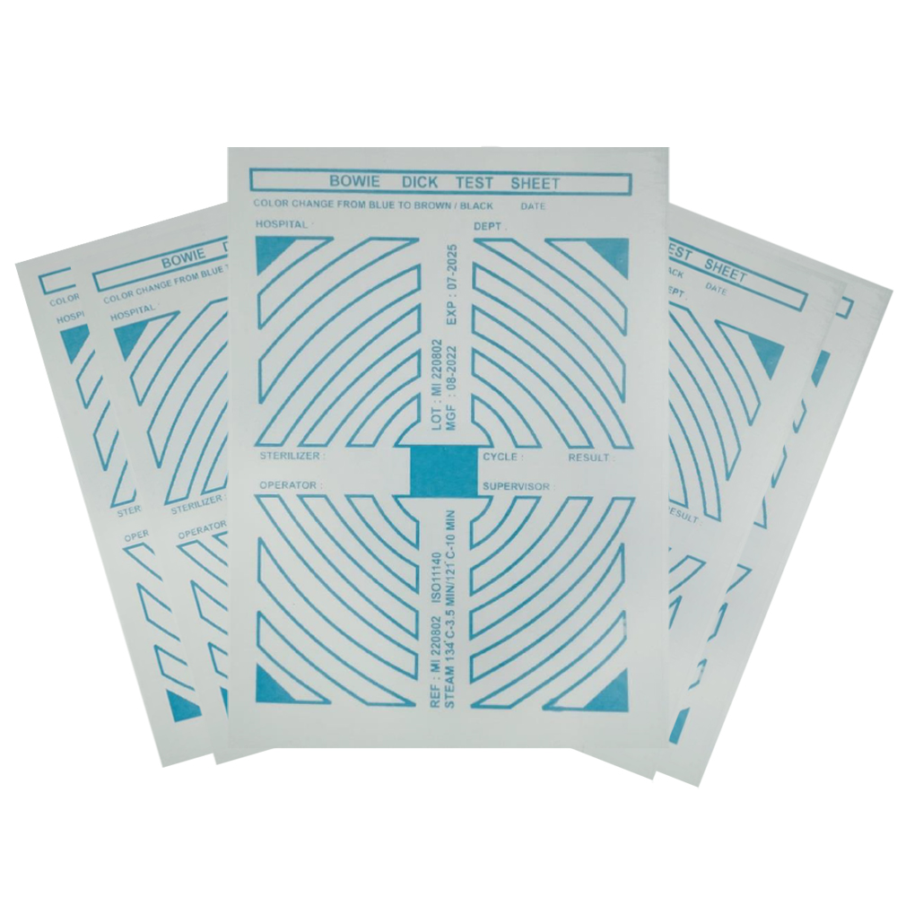 Bowie-Dick Test Sheets monitor steam sterilization efficiency, changing color to indicate proper air removal and steam penetration.