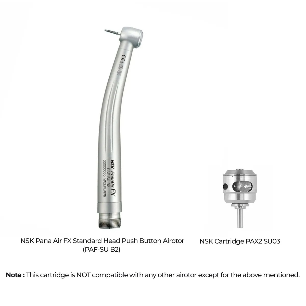 Yes, the NSK Cartridge PAX2 SU03 for Pana Air FX PAF-SU B2 Airotor Handpiece is compatible with the NSK Pana Air FX Standard Head Push Button Airotor...