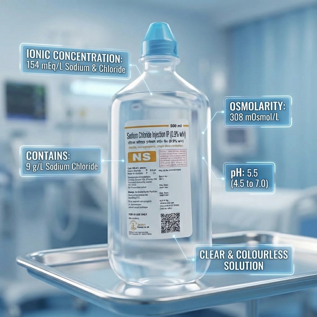 Sodium Chloride Saline Injection IP (0.9% W/V) comes in a plastic bottle with a screw-type blue cap. It is not a rubber stopper or spike-compatible ca...