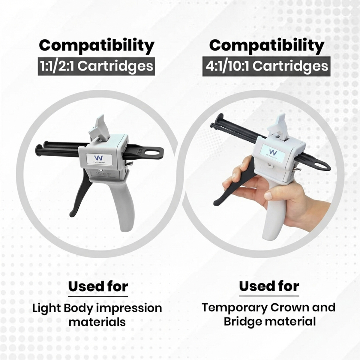 The Waldent Dispensing Gun comes in two ratios: 1:1 and 4:1. The difference lies in the slot size of the plunger, with both being suitable for differe...